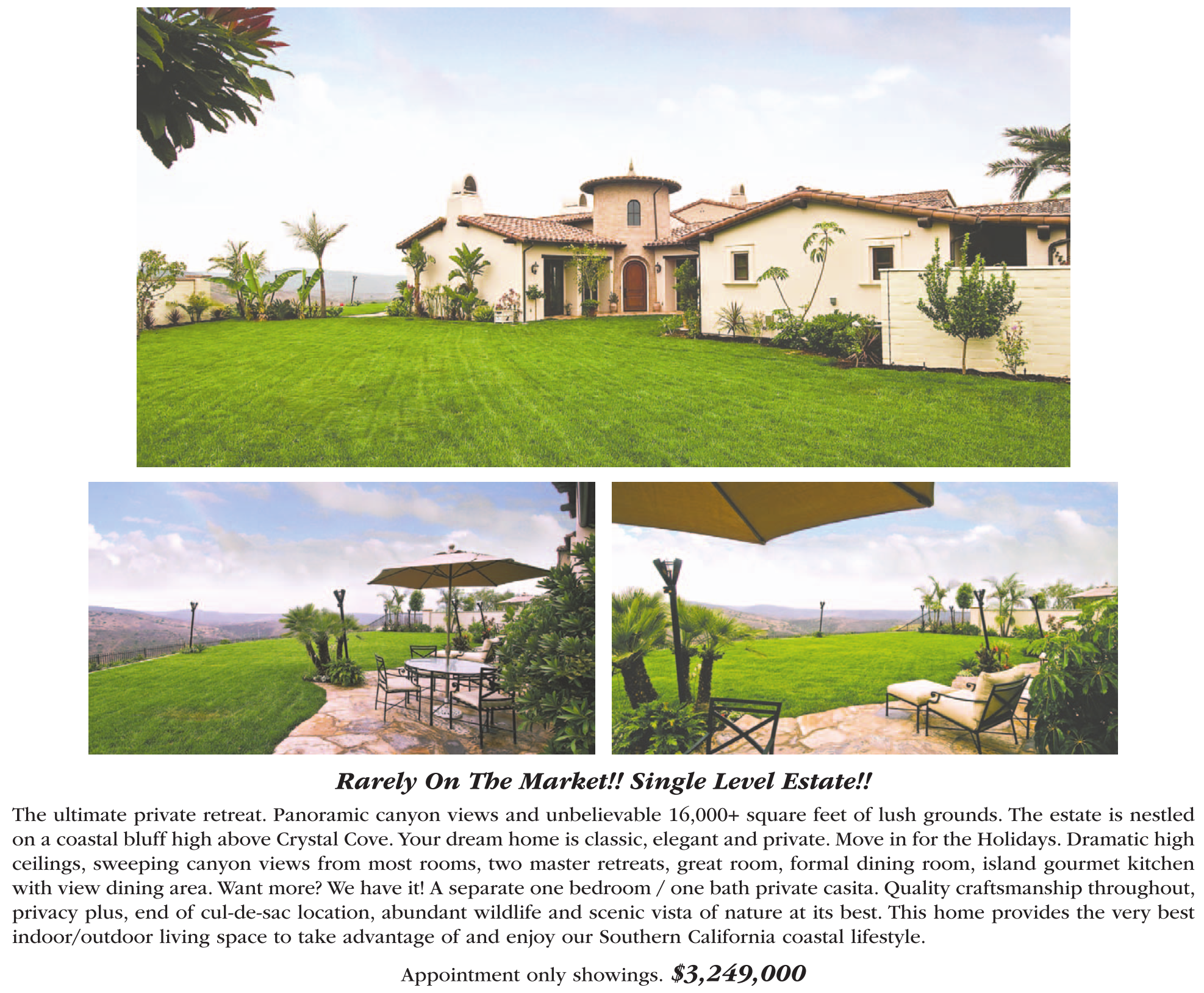 Rarely On The Market!! Single Level Estate!! The ultimate private retreat. Panoramic canyon views and unbelievable 16,000+ square feet of lush grounds. The estate is nestled on a coastal bluff high above Crystal Cove. Your dream home is classic, elegant and private. Move in for the Holidays. Dramatic high ceilings, sweeping canyon views from most rooms, two master retreats, great room, formal dining room, island gourmet kitchen with view dining area. Want more? We have it! A separate one bedroom / one bath private casita. Quality craftsmanship throughout, privacy plus, end of cul-de-sac location, abundant wildlife and scenic vista of nature at its best. This home provides the very best indoor/outdoor living space to take advantage of and enjoy our Southern California coastal lifestyle. Appointment only showings. $3,249,000