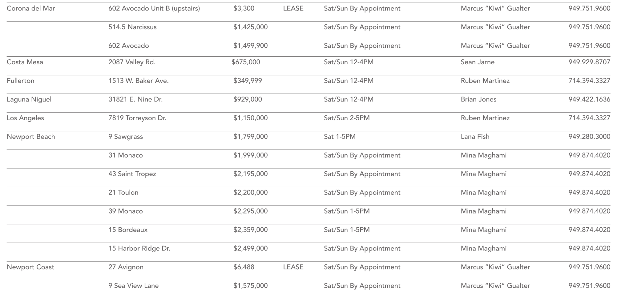 Los Angeles 7819 Torreyson Dr. $1,150,000 Sat/Sun 2-5PM Ruben Martinez 714.394.3327 Newport Beach 9 Sawgrass $1,799,000 Sat 1-5PM Lana Fish 949.280.3000 31 Monaco $1,999,000 Sat/Sun By Appointment Mina Maghami 949.874.4020 43 Saint Tropez $2,195,000 Sat/Sun By Appointment Mina Maghami 949.874.4020 21 Toulon $2,200,000 Sat/Sun By Appointment Mina Maghami 949.874.4020 39 Monaco $2,295,000 Sat/Sun 1-5PM Mina Maghami 949.874.4020 15 Bordeaux $2,359,000 Sat/Sun 1-5PM Mina Maghami 949.874.4020 15 Harbor Ridge Dr. $2,499,000 Sat/Sun By Appointment Mina Maghami 949.874.4020 Newport Coast 27 Avignon $6,488 LEASE Sat/Sun By Appointment Marcus “Kiwi” Gualter 949.751.9600 9 Sea View Lane $1,575,000 Sat/Sun By Appointment Marcus “Kiwi” Gualter 949.751.9600
