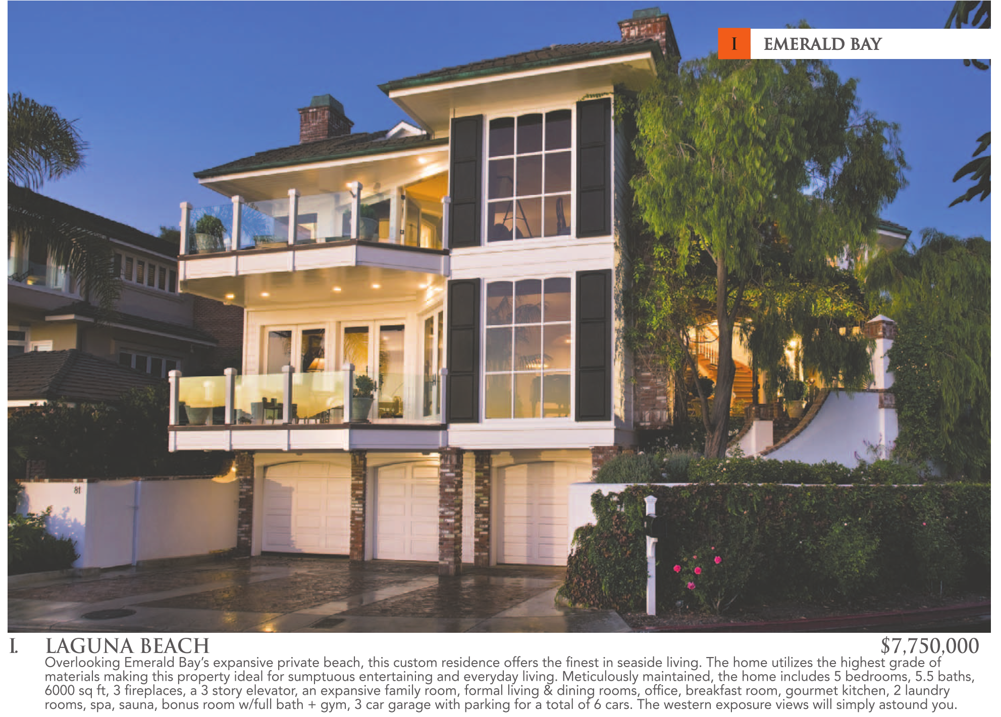 I EMERALD BAY I. LAGUNA BEACH $7,750,000 Overlooking Emerald Bay’s expansive private beach, this custom residence offers the finest in seaside living. The home utilizes the highest grade of materials making this property ideal for sumptuous entertaining and everyday living. Meticulously maintained, the home includes 5 bedrooms, 5.5 baths, 6000 sq ft, 3 fireplaces, a 3 story elevator, an expansive family room, formal living & dining rooms, office, breakfast room, gourmet kitchen, 2 laundry rooms, spa, sauna, bonus room w/full bath + gym, 3 car garage with parking for a total of 6 cars. The western exposure views will simply astound you.
