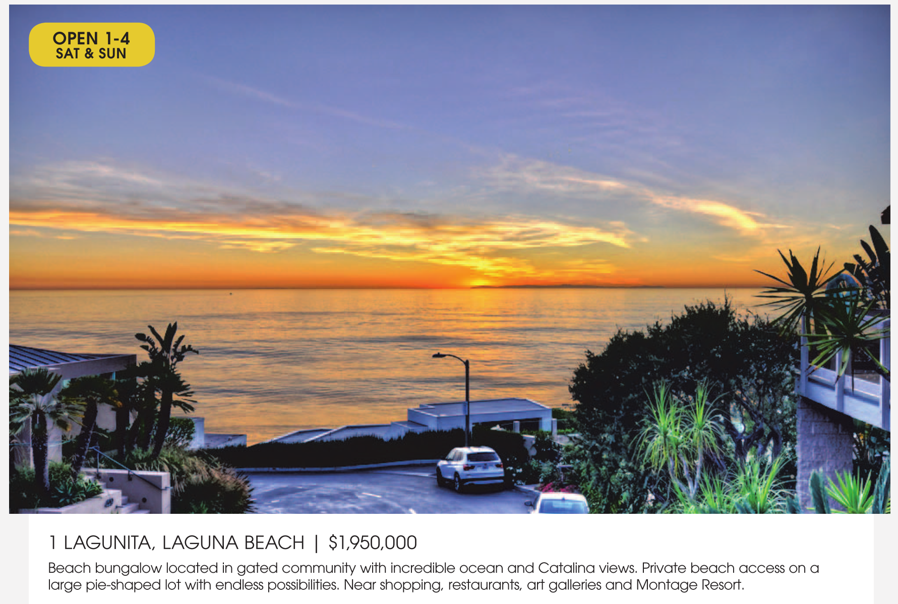 OPEN 1-4 SAT & SUN 1 LAGUNITA, LAGUNA BEACH | $1,950,000 Beach bungalow located in gated community with incredible ocean and Catalina views. Private beach access on a large pie-shaped lot with endless possibilities. Near shopping, restaurants, art galleries and Montage Resort.