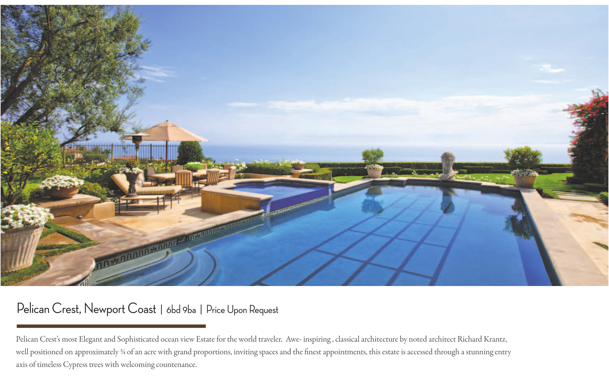 Pelican Crest’s most Elegant and Sophisticated ocean view Estate for the world traveler. Awe- inspiring , classical architecture by noted architect Richard Krantz, well positioned on approximately ¾ of an acre with grand proportions, inviting spaces and the finest appointments, this estate is accessed through a stunning entry axis of timeless Cypress trees with welcoming countenance.
