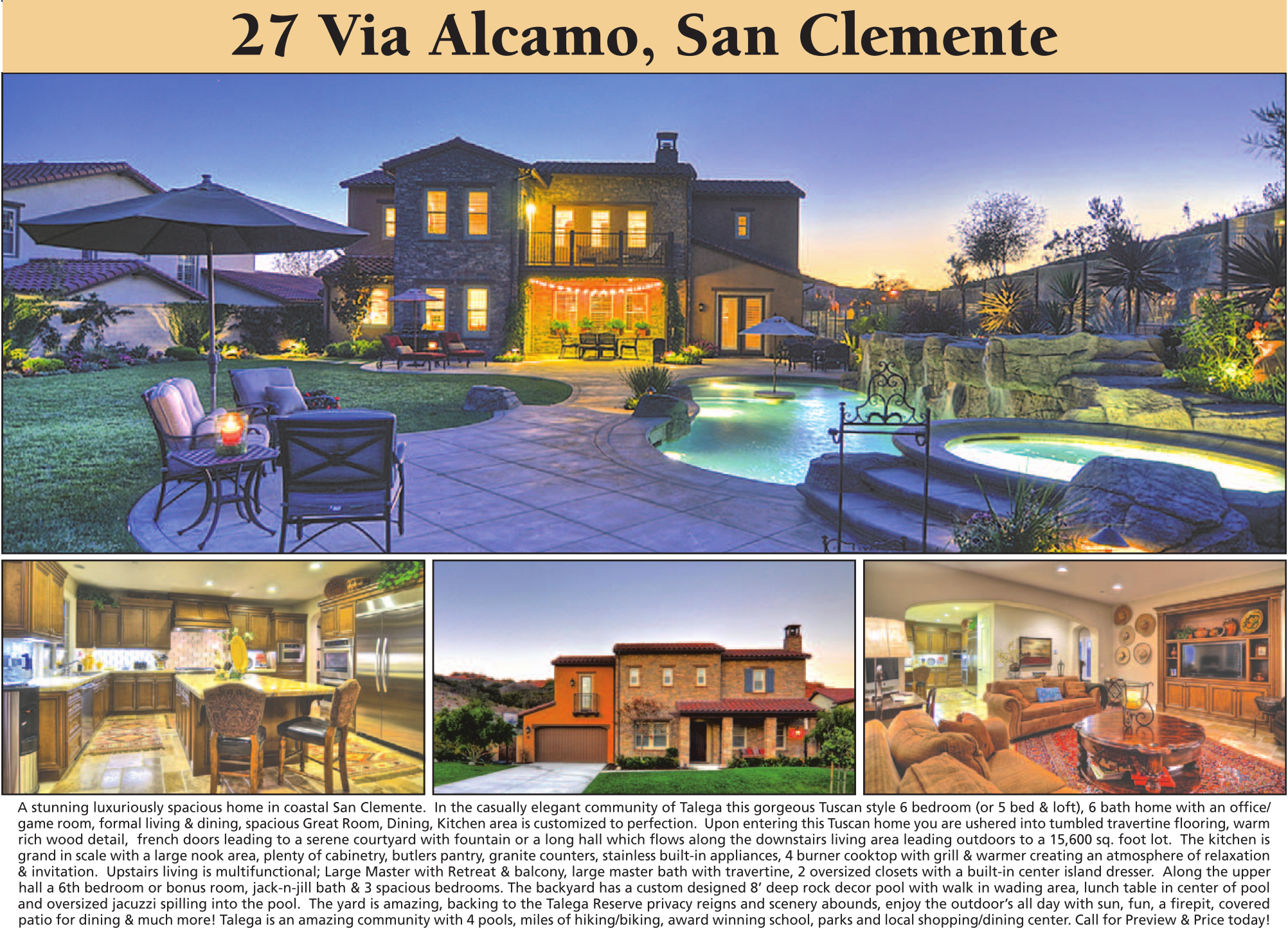 A stunning luxuriously spacious home in coastal San Clemente.  In the casually elegant community of Talega this gorgeous Tuscan style 6 bedroom (or 5 bed & loft), 6 bath home with an office/ game room, formal living & dining, spacious Great Room, Dining, Kitchen area is customized to perfection.  Upon entering this Tuscan home you are ushered into tumbled travertine flooring, warm rich wood detail,  french doors leading to a serene courtyard with fountain or a long hall which flows along the downstairs living area leading outdoors to a 15,600 sq. foot lot.  The kitchen is grand in scale with a large nook area, plenty of cabinetry, butlers pantry, granite counters, stainless built-in appliances, 4 burner cooktop with grill & warmer creating an atmosphere of relaxation & invitation.  Upstairs living is multifunctional; Large Master with Retreat & balcony, large master bath with travertine, 2 oversized closets with a built-in center island dresser.  Along the upper hall a 6th bedroom or bonus room, jack-n-jill bath & 3 spacious bedrooms. The backyard has a custom designed 8’ deep rock decor pool with walk in wading area, lunch table in center of pool and oversized jacuzzi spilling into the pool.  The yard is amazing, backing to the Talega Reserve privacy reigns and scenery abounds, enjoy the outdoor’s all day with sun, fun, a firepit, covered patio for dining & much more! Talega is an amazing community with 4 pools, miles of hiking/biking, award winning school, parks and local shopping/dining center. Call for Preview & Price today!