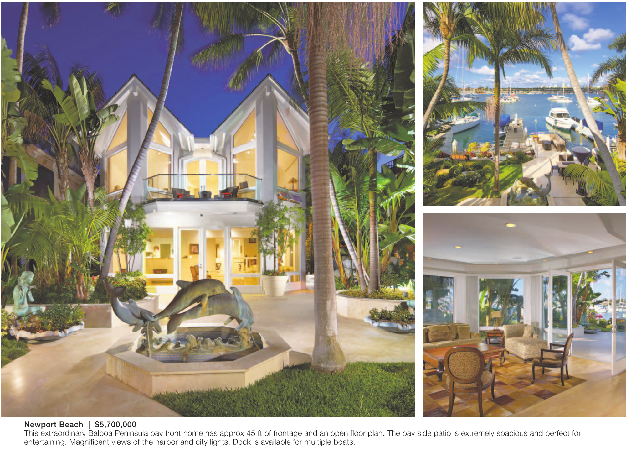 Newport Beach | $5,700,000 This extraordinary Balboa Peninsula bay front home has approx 45 ft of frontage and an open floor plan. The bay side patio is extremely spacious and perfect for entertaining. Magnificent views of the harbor and city lights. Dock is available for multiple boats. See also