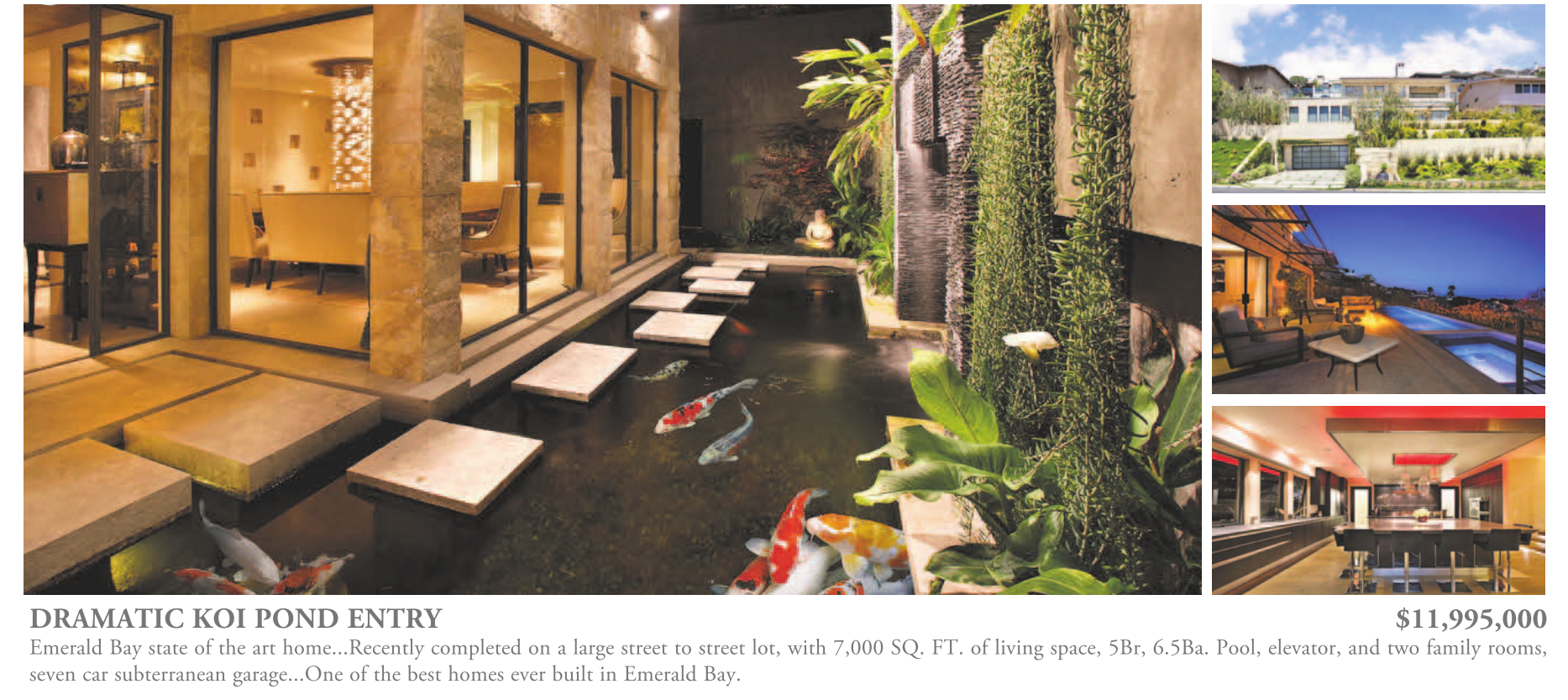 DRAMATIC KOI POND ENTRY $11,995,000 Emerald Bay state of the art home...Recently completed on a large street to street lot, with 7,000 SQ. FT. of living space, 5Br, 6.5Ba. Pool, elevator, and two family rooms, seven car subterranean garage...One of the best homes ever built in Emerald Bay.