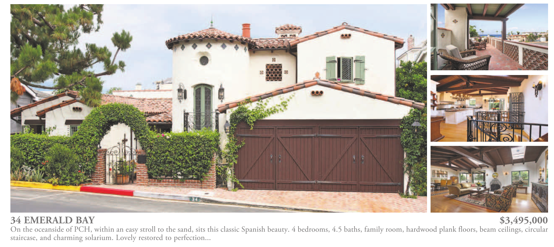 On the oceanside of PCH, within an easy stroll to the sand, sits this classic Spanish beauty. 4 bedrooms, 4.5 baths, family room, hardwood plank floors, beam ceilings, circular