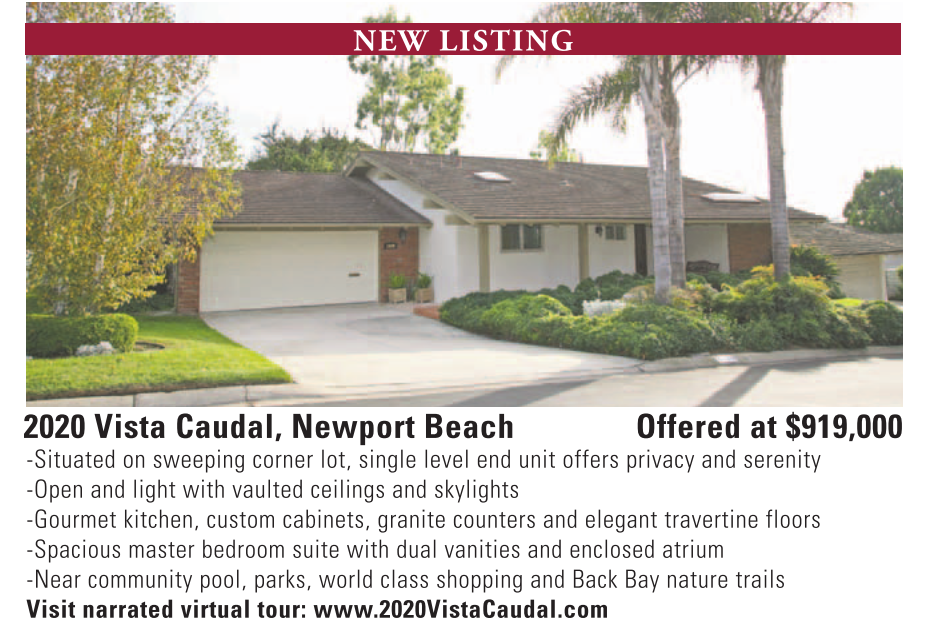 NEW LISTING 2020 Vista Caudal, Newport Beach Offered at $919,000 -Situated on sweeping corner lot, single level end unit offers privacy and serenity -Open and light with vaulted ceilings and skylights -Gourmet kitchen, custom cabinets, granite counters and elegant travertine floors -Spacious master bedroom suite with dual vanities and enclosed atrium -Near community pool, parks, world class shopping and Back Bay nature trails Visit narrated virtual tour: www.2020VistaCaudal.com See also