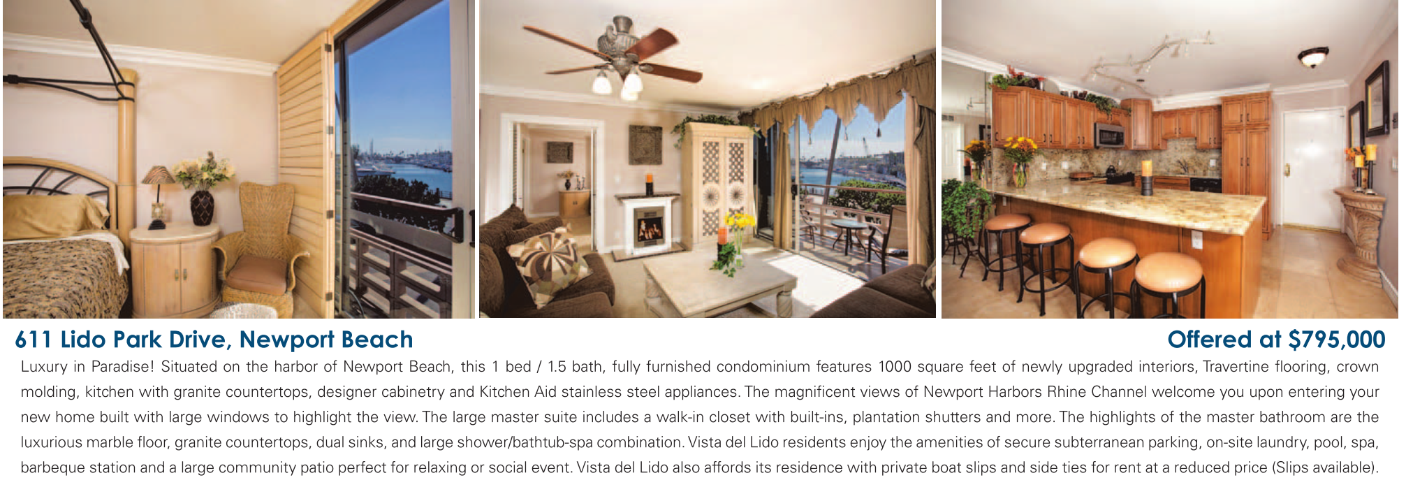 611 Lido Park Drive, Newport Beach Offered at $795,000 Luxury in Paradise! Situated on the harbor of Newport Beach, this 1 bed / 1.5 bath, fully furnished condominium features 1000 square feet of newly upgraded interiors, Travertine flooring, crown molding, kitchen with granite countertops, designer cabinetry and Kitchen Aid stainless steel appliances. The magnificent views of Newport Harbors Rhine Channel welcome you upon entering your new home built with large windows to highlight the view. The large master suite includes a walk-in closet with built-ins, plantation shutters and more. The highlights of the master bathroom are the luxurious marble floor, granite countertops, dual sinks, and large shower/bathtub-spa combination. Vista del Lido residents enjoy the amenities of secure subterranean parking, on-site laundry, pool, spa, barbeque station and a large community patio perfect for relaxing or social event. Vista del Lido also affords its residence with private boat slips and side ties for rent at a reduced price (Slips available).