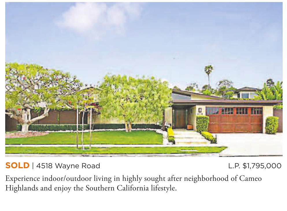 SOLD | 4518 Wayne Road L.P. $1,795,000 Experience indoor/outdoor living in highly sought after neighborhood of Cameo Highlands and enjoy the Southern California lifestyle.