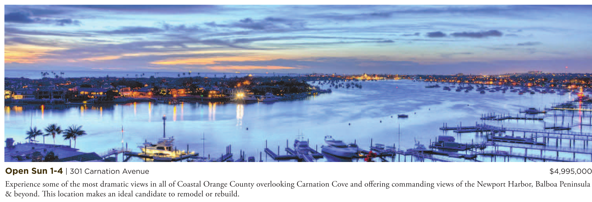 Open Sun 1-4 | 301 Carnation Avenue $4,995,000 Experience some of the most dramatic views in all of Coastal Orange County overlooking Carnation Cove and offering commanding views of the Newport Harbor, Balboa Peninsula & beyond. This location makes an ideal candidate to remodel or rebuild.