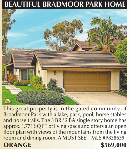 This great property is in the gated community of Broadmoor Park with a lake, park, pool, horse stables and horse trails. The 3 BR / 2 BA single story home has approx. 1,771 SQ FT of living space and offers a an open floor plan with views of the mountains from the living room and dining room. A MUST SEE!! MLS #P838639 ORANGE $569,000