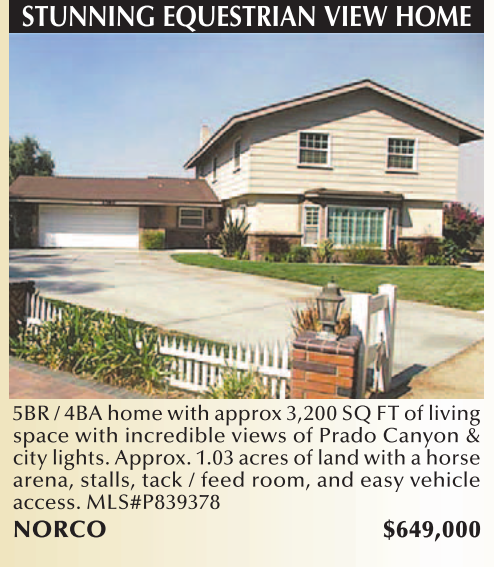 5BR / 4BA home with approx 3,200 SQ FT of living space with incredible views of Prado Canyon & city lights. Approx. 1.03 acres of land with a horse arena, stalls, tack / feed room, and easy vehicle access. MLS#P839378 NORCO $649,000