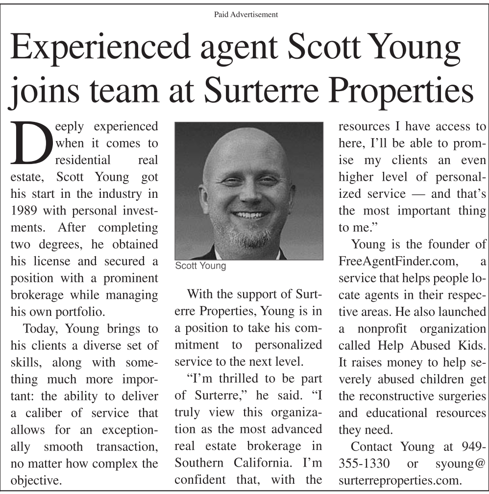 Deeply experienced when it comes to residential real estate, Scott Young got his start in the industry in 1989 with personal investments. After completing two degrees, he obtained his license and secured a position with a prominent brokerage while managing his own portfolio. Today, Young brings to his clients a diverse set of skills, along with something much more important: the ability to deliver a caliber of service that allows for an exceptionally smooth transaction, no matter how complex the objective. Paid Advertisement Experienced agent Scott Young joins team at Surterre Properties Scott Young With the support of Surterre Properties, Young is in a position to take his commitment to personalized service to the next level. “I’m thrilled to be part of Surterre,” he said. “I truly view this organization as the most advanced real estate brokerage in Southern California. I’m confident that, with the resources I have access to here, I’ll be able to promise my clients an even higher level of personalized service — and that’s the most important thing to me.” Young is the founder of FreeAgentFinder.com, a service that helps people locate agents in their respective areas. He also launched a nonprofit organization called Help Abused Kids. It raises money to help severely abused children get the reconstructive surgeries and educational resources they need. Contact Young at 949- 355-1330 or syoung@ surterreproperties.com.