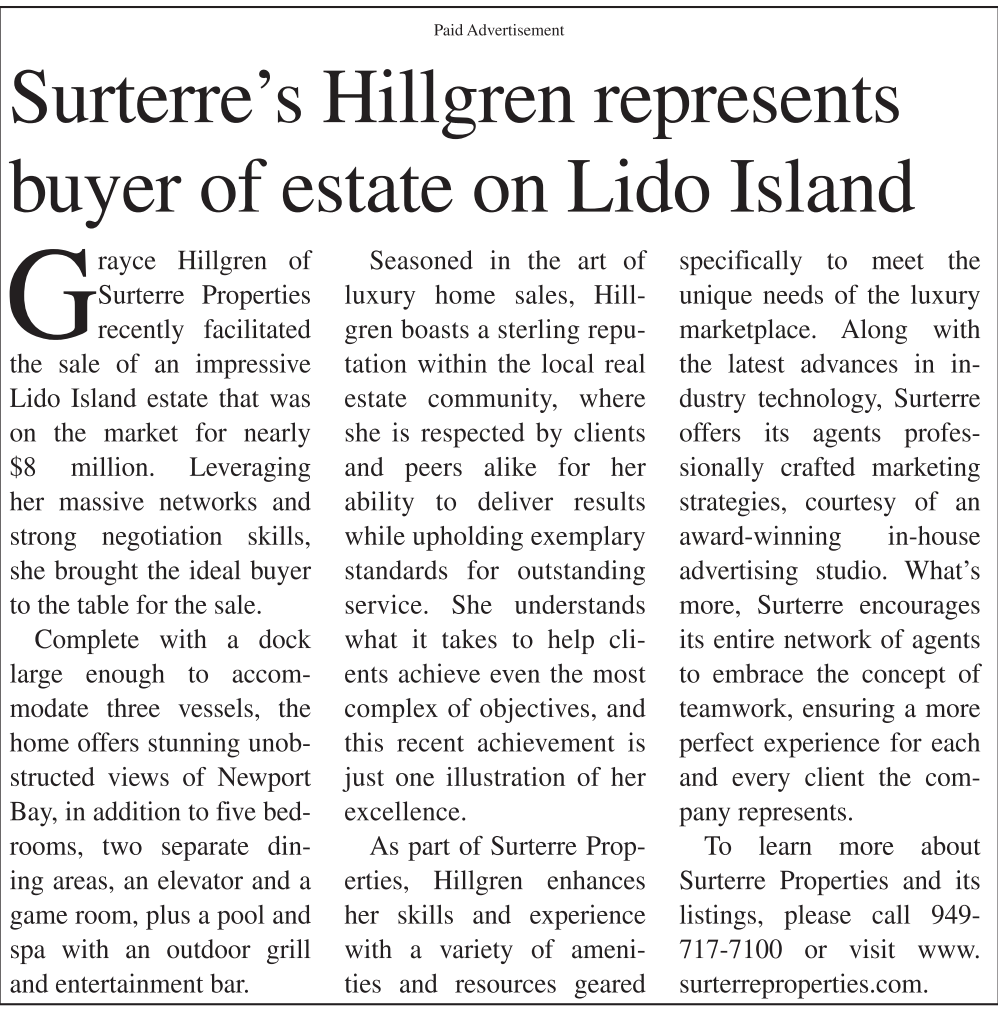 Paid Advertisement Surterre’s Hillgren represents buyer of estate on Lido Island Grayce Hillgren of Surterre Properties recently facilitated the sale of an impressive Lido Island estate that was on the market for nearly $8 million. Leveraging her massive networks and strong negotiation skills, she brought the ideal buyer to the table for the sale. Complete with a dock large enough to accommodate three vessels, the home offers stunning unobstructed views of Newport Bay, in addition to five bedrooms, two separate dining areas, an elevator and a game room, plus a pool and spa with an outdoor grill and entertainment bar. Seasoned in the art of luxury home sales, Hillgren boasts a sterling reputation within the local real estate community, where she is respected by clients and peers alike for her ability to deliver results while upholding exemplary standards for outstanding service. She understands what it takes to help clients achieve even the most complex of objectives, and this recent achievement is just one illustration of her excellence. As part of Surterre Properties, Hillgren enhances her skills and experience with a variety of amenities and resources geared specifically to meet the unique needs of the luxury marketplace. Along with the latest advances in industry technology, Surterre offers its agents professionally crafted marketing strategies, courtesy of an award-winning in-house advertising studio. What’s more, Surterre encourages its entire network of agents to embrace the concept of teamwork, ensuring a more perfect experience for each and every client the company represents. To learn more about Surterre Properties and its listings, please call 949- 717-7100 or visit www. surterreproperties.com. See also