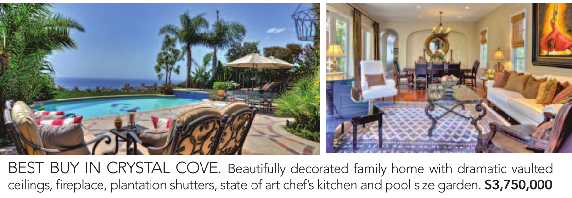 BEST BUY IN CRYSTAL COVE. Beautifully decorated family home with dramatic vaulted ceilings, fireplace, plantation shutters, state of art chef’s kitchen and pool size garden. $3,750,000