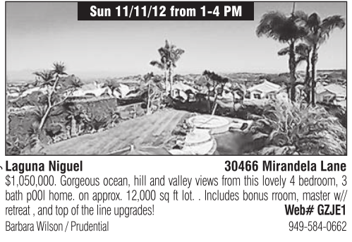 Sun 11/11/12 from 1-4 PM Laguna Niguel 30466 Mirandela Lane $1,050,000. Gorgeous ocean, hill and valley views from this lovely 4 bedroom, 3 bath p00l home. on approx. 12,000 sq ft lot. . Includes bonus rroom, master w// retreat , and top of the line upgrades! Web# GZJE1 Barbara Wilson / Prudential 949-584-0662