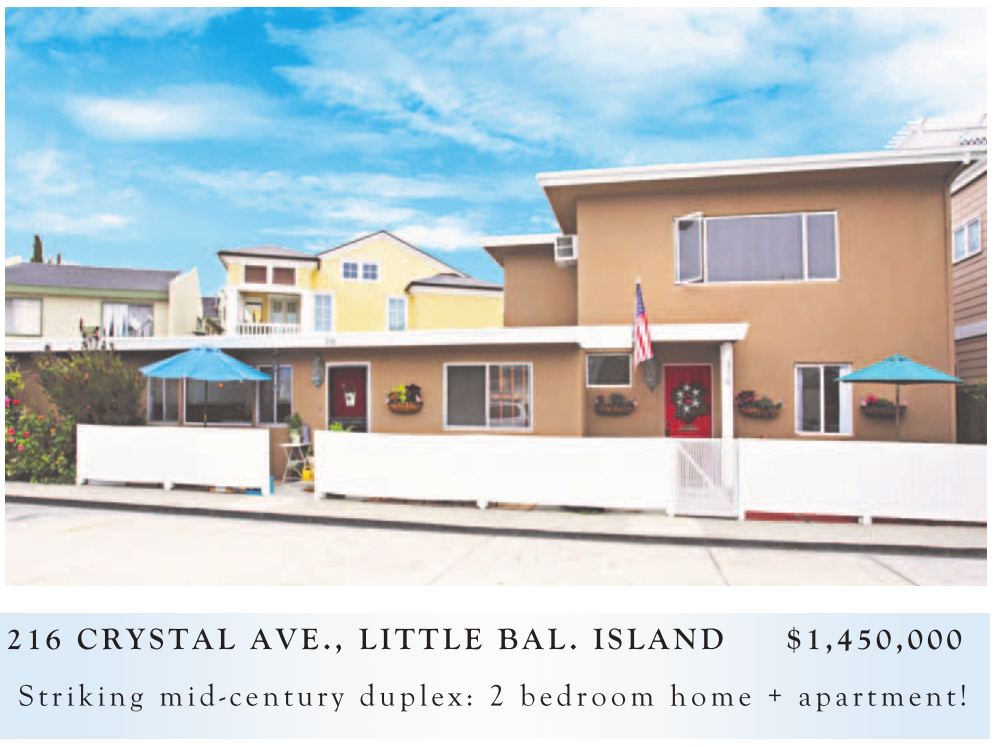 216 CRYSTAL AVE., LITTLE BAL. ISLAND $1,450,000 Striking mid-century duplex: 2 bedroom home + apartment!