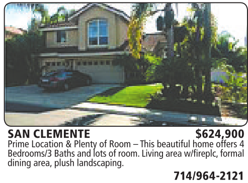 SAN CLEMENTE $624,900 Prime Location &Plenty of Room –This beautiful home offers 4 Bedrooms/3 Bathsand lots of room. Living area w/fireplc, formal dining area,plush landscaping.