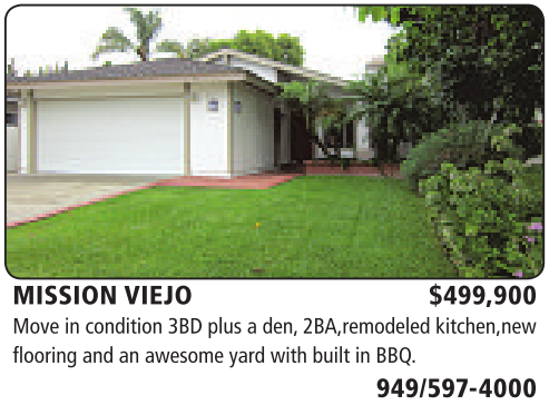 MISSION VIEJO $499,900 Move in condition 3BD plus aden, 2BA,remodeled kitchen,new flooring and an awesome yard with built in BBQ.