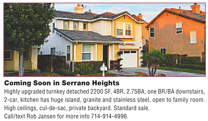 Coming Soon in Serrano Heights Highlyupgradedturnkeydetached2200SF, 4BR,2.75BA, oneBR/BA downstairs, 2-car, kitchen has huge island, granite and stainless steel, open tofamily room. High ceilings, cul-de-sac, privatebackyard. Standard sale. Call/text Rob Jansen formoreinfo 714-914-4996.