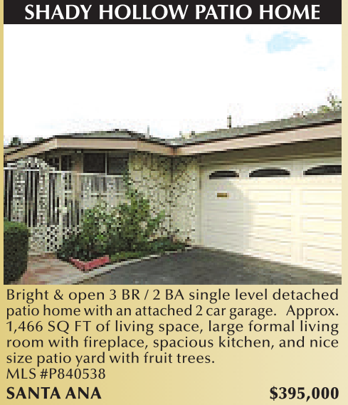 SHADY HOLLOW PATIO HOME Bright & open 3 BR / 2 BA single level detached patiohomewithanattached2car garage. Approx. 1,466 SQ FT of living space, large formal living room with fireplace, spacious kitchen, and nice size patioyardwithfruit trees. MLS #P840538 SANTA ANA $395,000