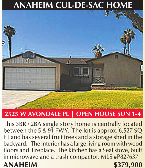 ANAHEIM CUL-DE-SAC HOME 2525 W AVONDALE PL | OPEN HOUSE SUN 1-4 This 3BR /2BA single story home is centrally located between the 5&91FWY. The lot isapprox. 6,527 SQ FT and hasseveral fruittrees and astorage shed in the backyard. The interior hasalarge living room with wood floorsand fireplace. Thekitchen hasaSealstove,built in microwaveand atrash compactor.MLS #P827637 ANAHEIM $379,900