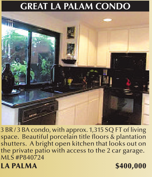 3BR/3BAcondo,withapprox. 1,315SQFTofliving space. Beautifulporcelain titlefloors &plantation shutters. Abright open kitchenthatlooks outon the private patiowithaccesstothe 2car garage. MLS #P840724 LA PALMA $400,000