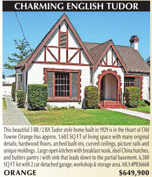 CHARMING ENGLISH TUDOR This beautiful 3BR/2BATudor style home built in1929 is in the Heart of Old Towne Orange has approx. 1,603 SQFTofliving space with many original details; hardwood floors, arched built-ins, curved ceilings, picture rails and unique moldings. Large open kitchen with breakfastnook, duelChinahutches, and butlers pantry /with sink that leads down tothe partial basement. 6,500 SQ FT lotwith2car detachedgarage, workshop &storage area.MLS #P836668 ORANGE $649,900