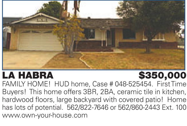 LA HABRA $350,000 FAMILY HOME! HUD home, Case # 048-525454. FirstTime Buyers! This home offers 3BR, 2BA, ceramic tile in kitchen, hardwood floors, large backyard with covered patio! Home has lots of potential. 562/822-7646 or 562/860-2443 Ext. 100 www.own-your-house.com