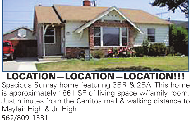 Just minutes from the Cerritos mall & walking distance to Mayfair High & Jr. High. 562/809-1331