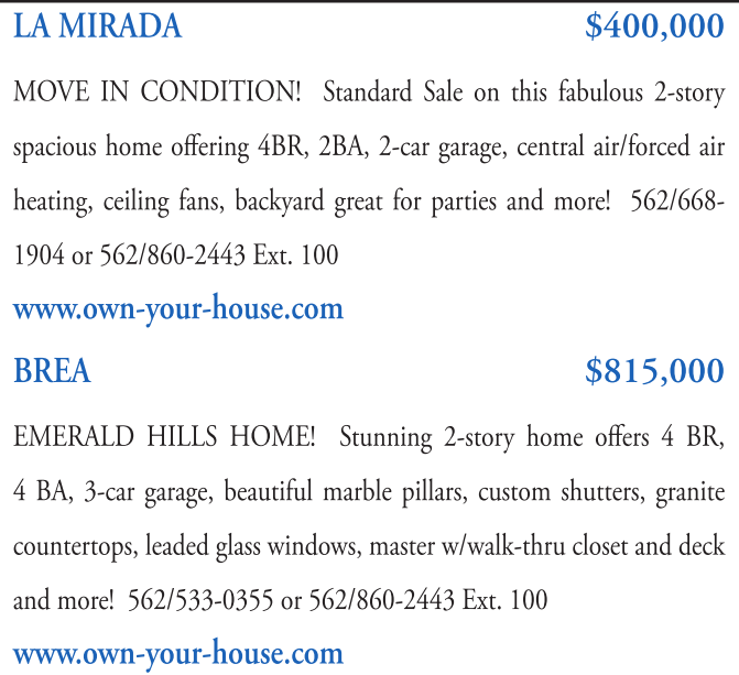 LA MIRADA $400,000 MOVE IN CONDITION! Standard Sale on this fabulous 2-story spacious home offering 4BR, 2BA, 2-car garage, central air/forced air heating, ceiling fans, backyard great for parties and more! 562/668- 1904 or 562/860-2443 Ext. 100 www.own-your-house.com BREA $815,000 EMERALD HILLS HOME! Stunning 2-story home offers 4 BR, 4 BA, 3-car garage, beautiful marble pillars, custom shutters, granite countertops, leaded glass windows, master w/walk-thru closet and deck and more! 562/533-0355 or 562/860-2443 Ext. 100 www.own-your-house.com