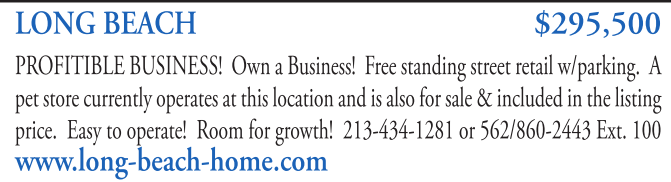 LONG BEACH $295,500 PROFITIBLE BUSINESS! Own aBusiness! Free standing street retail w/parking. Apet storecurrently operates at this location and is also for sale &included in the listing price. Easy to operate! Room for growth! 213-434-1281 or 562/860-2443 Ext. 100 www.long-beach-home.com