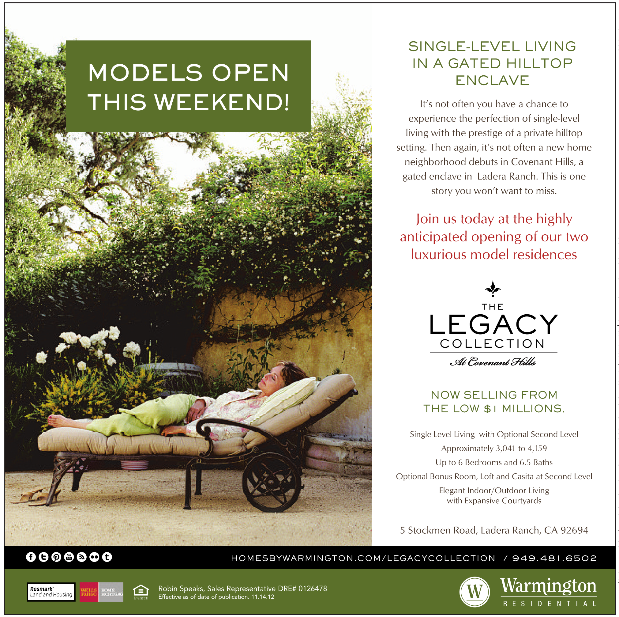 Models open this weekend! SINGLE-LEVEL LIVING IN A GATED HILLTOP ENCLAVE It’s not often you have a chance to experience the perfection of single-level living with the prestige of a private hilltop setting. Then again, it’s not often a new home neighborhood debuts in Covenant Hills, a gated enclave in Ladera Ranch. This is one story you won’t want to miss. Join us today at the highly anticipated opening of our two luxurious model residences NOw SELLING frOm THE LOw $1 mILLIONS. Single-Level Living with Optional Second Level Approximately 3,041 to 4,159 Up to 6 Bedrooms and 6.5 Baths Optional Bonus Room, Loft and Casita at Second Level Elegant Indoor/Outdoor Living with Expansive Courtyards 5 Stockmen Road, Ladera Ranch, CA 92694 HOmESbywArmINGTON.COm/LEGACyCOLLECTION / 949.481.6502 Robin Speaks, Sales Representative DRE# 0126478 Effective as of date of publication. 11.14.12