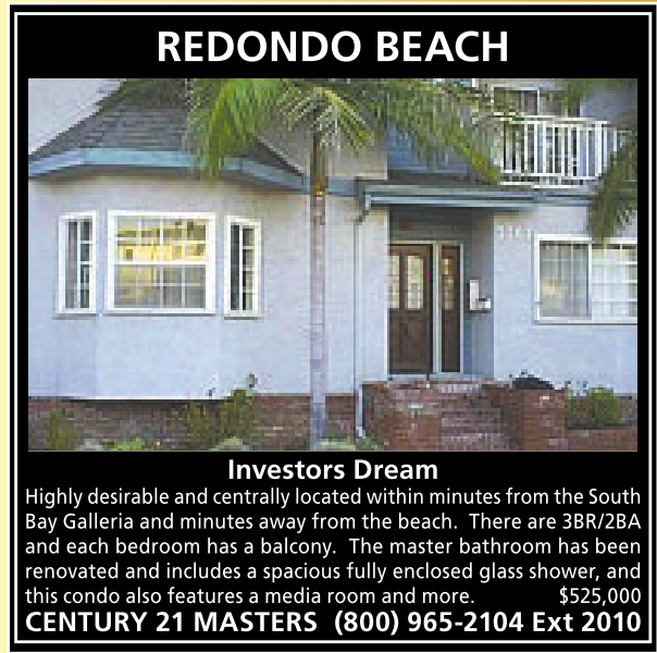 REDONDO BEACH Investors Dream Highlydesirable andcentrally locatedwithin minutesfromthe South Bay Galleria and minutes away from the beach. There are 3BR/2BA and each bedroom has abalcony. The master bathroom has been renovated and includes aspacious fully enclosed glass shower, and this condo also features amedia room and more. $525,000 CENTURY 21 MASTERS (800) 965-2104 Ext 2010