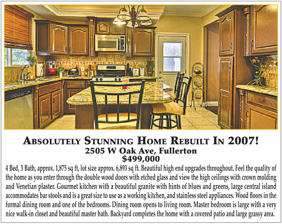 ABSOLUTELY STUNNING HOME REBUILT IN 2007! 2505 W Oak Ave, Fullerton $499,000 4Bed, 3Bath, approx. 1,875 sq ft, lot size approx. 6,893 sq ft. Beautiful high end upgrades throughout. Feel the quality of the home as you enter through the double wood doors with etched glass and view the high ceilings with crown molding and Venetian plaster. Gourmet kitchen with abeautiful granite with hints of blues and greens, large central island accommodates bar stools and is agreat size to use as aworking kitchen, and stainless steel appliances. Wood floors in the formal dining room and one of the bedrooms. Dining room opens to living room. Master bedroom is large with avery nice walk-incloset and beautiful master bath. Backyard completes the home with acovered patio and large grassy area.