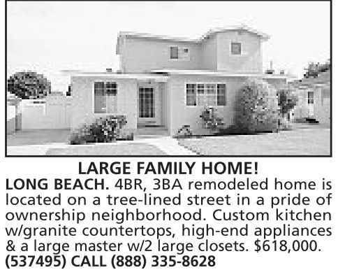 LARGE FAMILY HOME! LONG BEACH. 4BR, 3BA remodeled home is located on a tree-lined street in a pride of ownership neighborhood. Custom kitchen w/granite countertops, high-end appliances & a large master w/2 large closets. $618,000. (537495) CALL (888) 335-8628