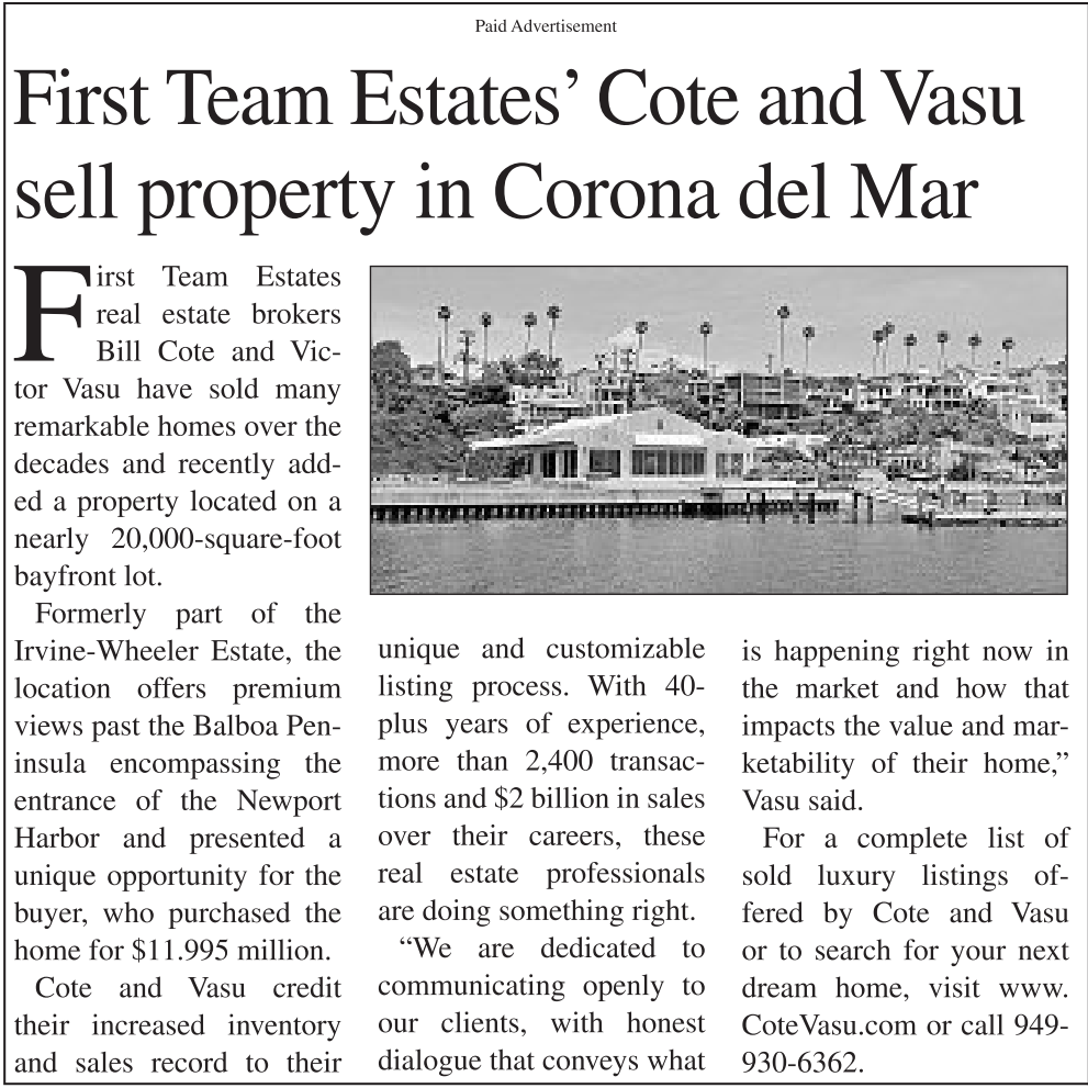 First Team Estates’ Cote and Vasu sell property in Corona del Mar