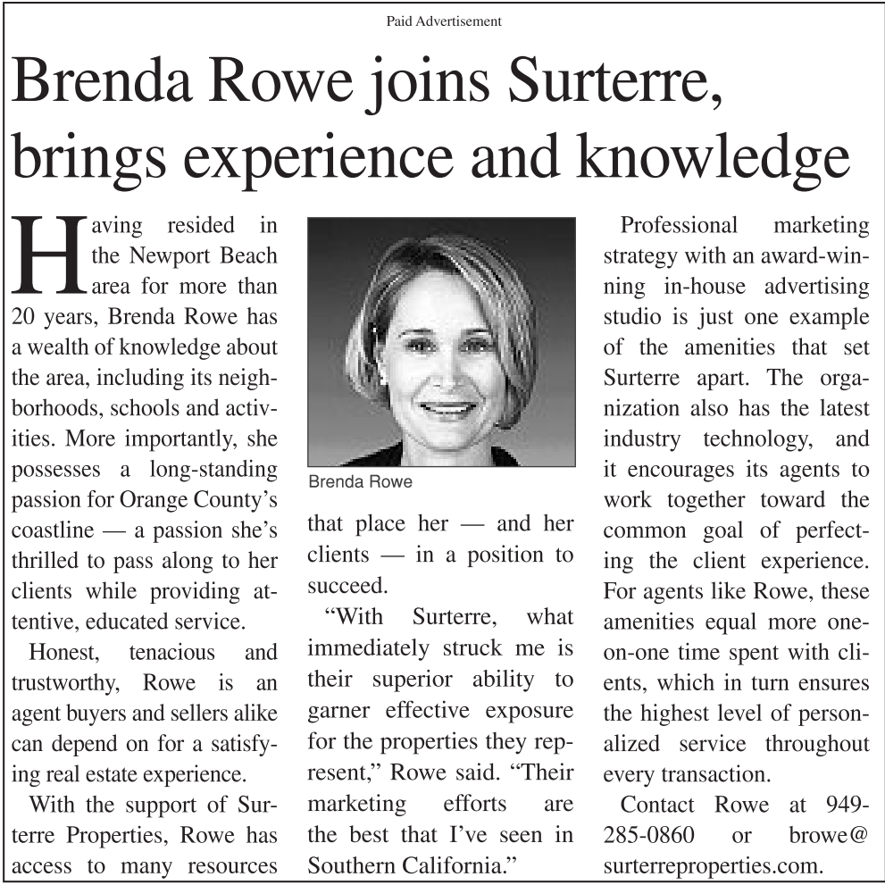 Having resided in the Newport Beach area for more than 20 years, Brenda Rowe has a wealth of knowledge about the area, including its neighborhoods, schools and activities. More importantly, she possesses a long-standing passion for Orange County’s coastline — a passion she’s thrilled to pass along to her clients while providing attentive, educated service. Honest, tenacious and trustworthy, Rowe is an agent buyers and sellers alike can depend on for a satisfying real estate experience. With the support of Surterre Properties, Rowe has access to many resources that place her — and her clients — in a position to succeed. “With Surterre, what immediately struck me is their superior ability to garner effective exposure for the properties they represent,” Rowe said. “Their marketing efforts are the best that I’ve seen in Southern California.” Paid Advertisement Brenda Rowe joins Surterre, brings experience and knowledge Brenda Rowe Professional marketing strategy with an award-winning in-house advertising studio is just one example of the amenities that set Surterre apart. The organization also has the latest industry technology, and it encourages its agents to work together toward the common goal of perfecting the client experience. For agents like Rowe, these amenities equal more oneon-one time spent with clients, which in turn ensures the highest level of personalized service throughout every transaction. Contact Rowe at 949- 285-0860 or browe@ surterreproperties.com.