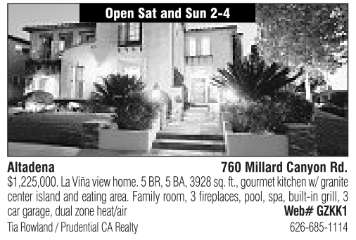 Altadena Open Sat and Sun 2-4 760 Millard Canyon Rd. TiaRowland /Prudential CA Realty 626-685-1114 $1,225,000. La Viña view home. 5BR, 5BA, 3928 sq. ft., gourmet kitchen w/ granite center island and eating area. Family room, 3fireplaces, pool, spa, built-in grill, 3 car garage, dual zone heat/air Web# GZKK1