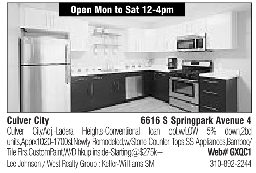 Open Mon to Sat 12-4pm Culver City 6616 SSpringpark Avenue 4 Culver CityAdj.-Ladera Heights-Conventional loan opt.w/LOW 5% down,2bd units,Apprx1020-1700sf,Newly Remodeled,w/Stone Counter Tops,SS Appliances,Bamboo/ Tile Flrs.CustomPaint,W/D hkup inside-Starting@$275k+ Web# GXQC1 LeeJohnson /West Realty Group :Keller-Williams SM 310-892-2244 See also