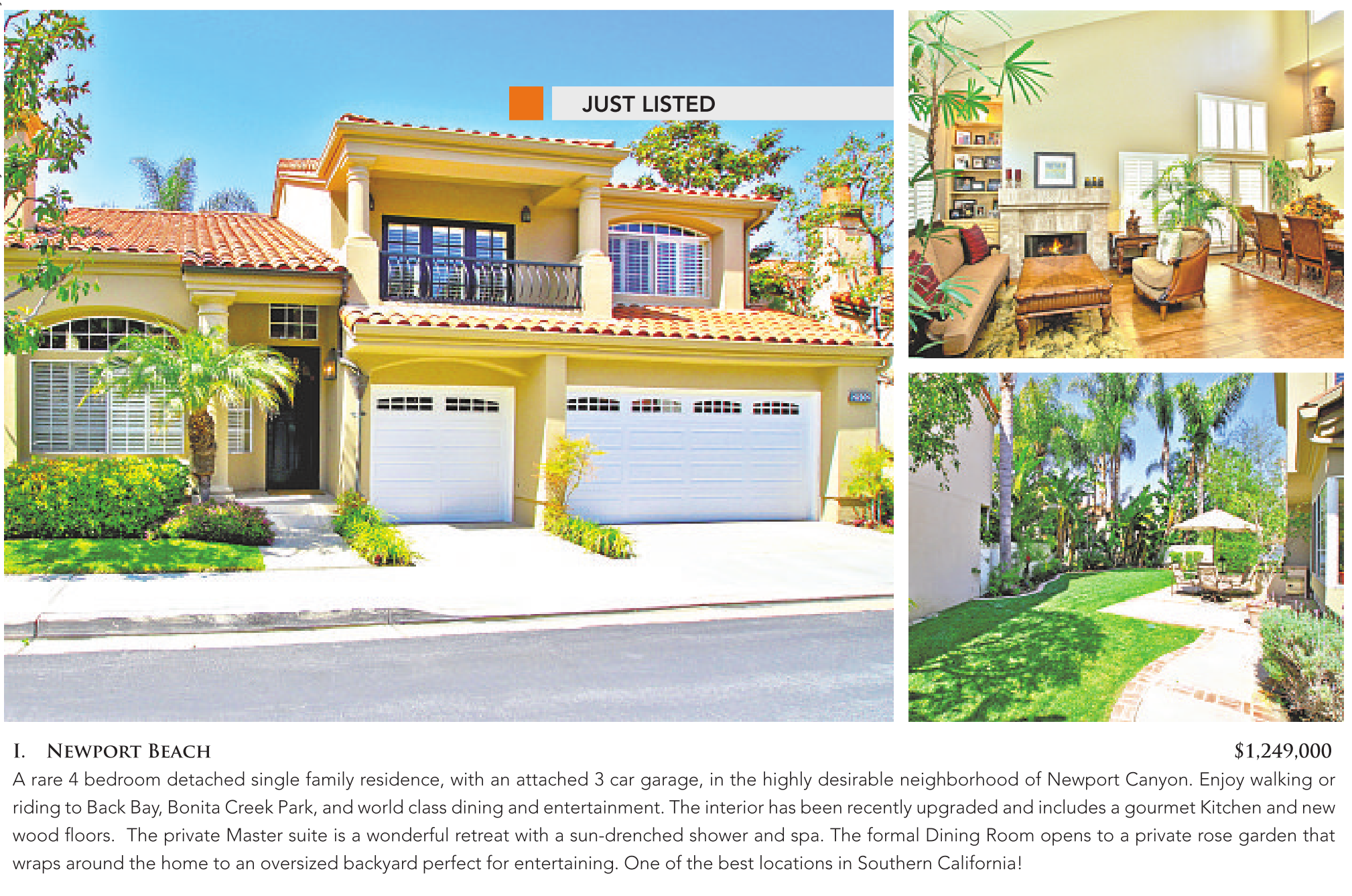 I. Newport Beach $1,249,000 A rare 4 bedroom detached single family residence, with an attached 3 car garage, in the highly desirable neighborhood of Newport Canyon. Enjoy walking or riding to Back Bay, Bonita Creek Park, and world class dining and entertainment. The interior has been recently upgraded and includes a gourmet Kitchen and new wood floors. The private Master suite is a wonderful retreat with a sun-drenched shower and spa. The formal Dining Room opens to a private rose garden that wraps around the home to an oversized backyard perfect for entertaining. One of the best locations in Southern California!
