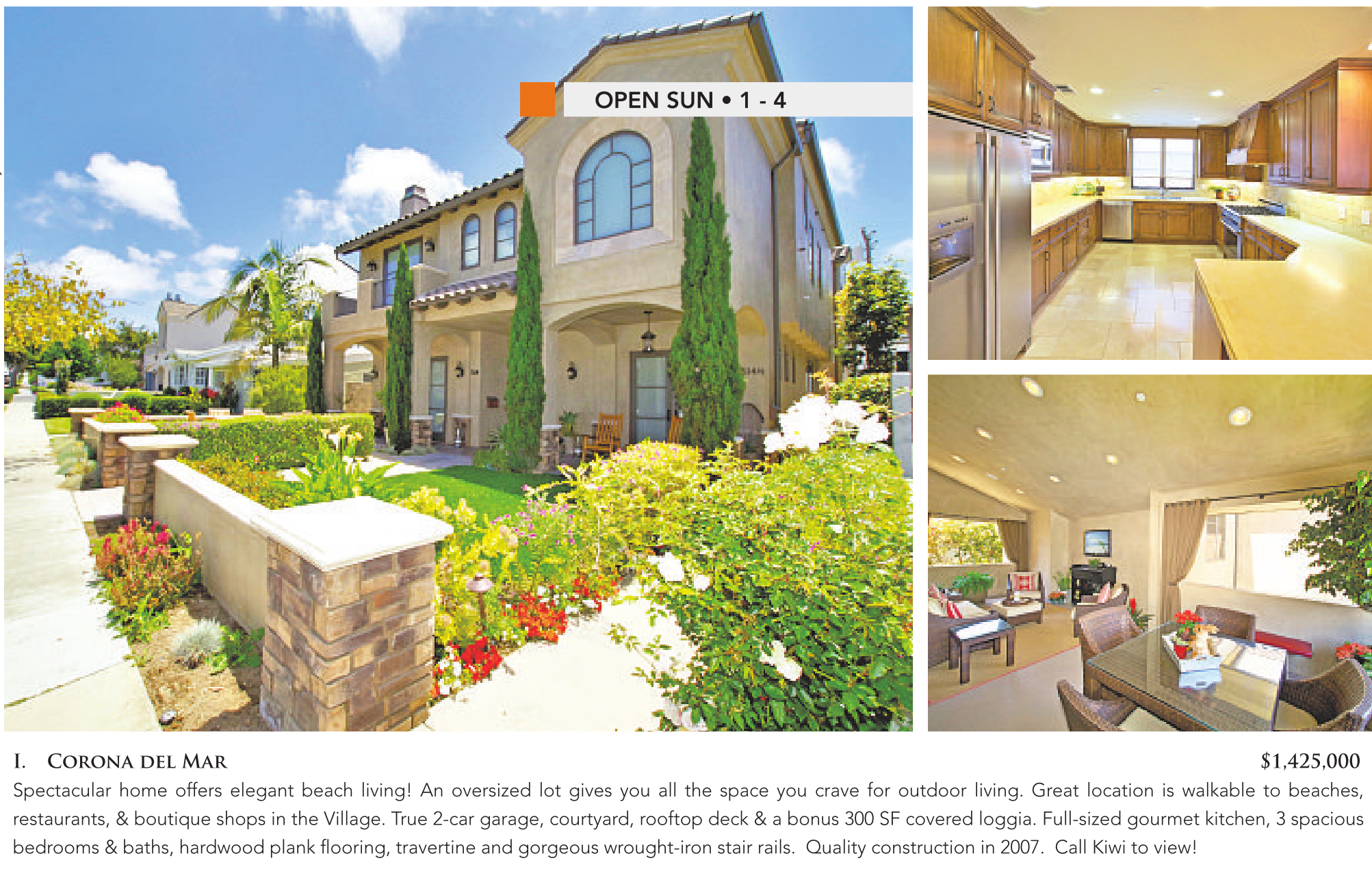 I. Corona del Mar $1,425,000 Spectacular home offers elegant beach living! An oversized lot gives you all the space you crave for outdoor living. Great location is walkable to beaches, restaurants, & boutique shops in the Village. True 2-car garage, courtyard, rooftop deck & a bonus 300 SF covered loggia. Full-sized gourmet kitchen, 3 spacious bedrooms & baths, hardwood plank flooring, travertine and gorgeous wrought-iron stair rails. Quality construction in 2007. Call Kiwi to view!