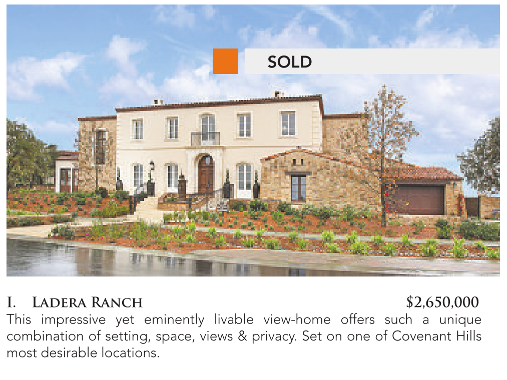 I. Ladera Ranch $2,650,000 This impressive yet eminently livable view-home offers such a unique combination of setting, space, views & privacy. Set on one of Covenant Hills most desirable locations.