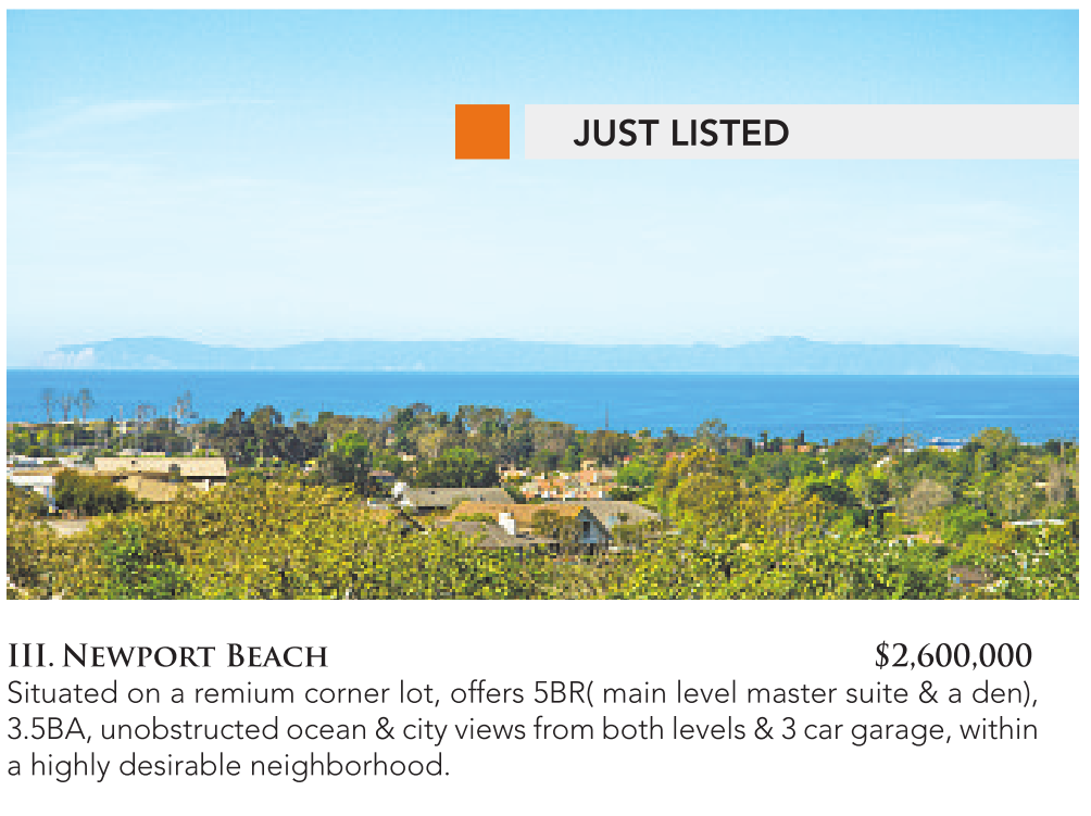 III. Newport Beach $2,600,000 Situated on a remium corner lot, offers 5BR( main level master suite & a den), 3.5BA, unobstructed ocean & city views from both levels & 3 car garage, within a highly desirable neighborhood.