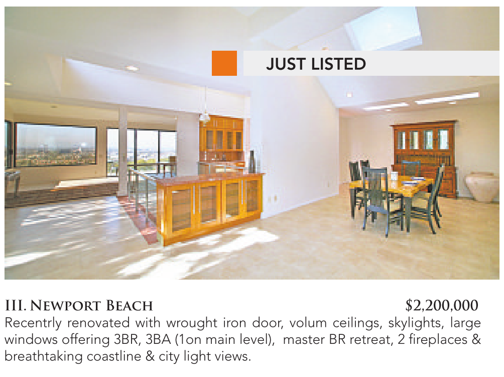 III. Newport Beach $2,200,000 Recentrly renovated with wrought iron door, volum ceilings, skylights, large windows offering 3BR, 3BA (1on main level), master BR retreat, 2 fireplaces & breathtaking coastline & city light views.