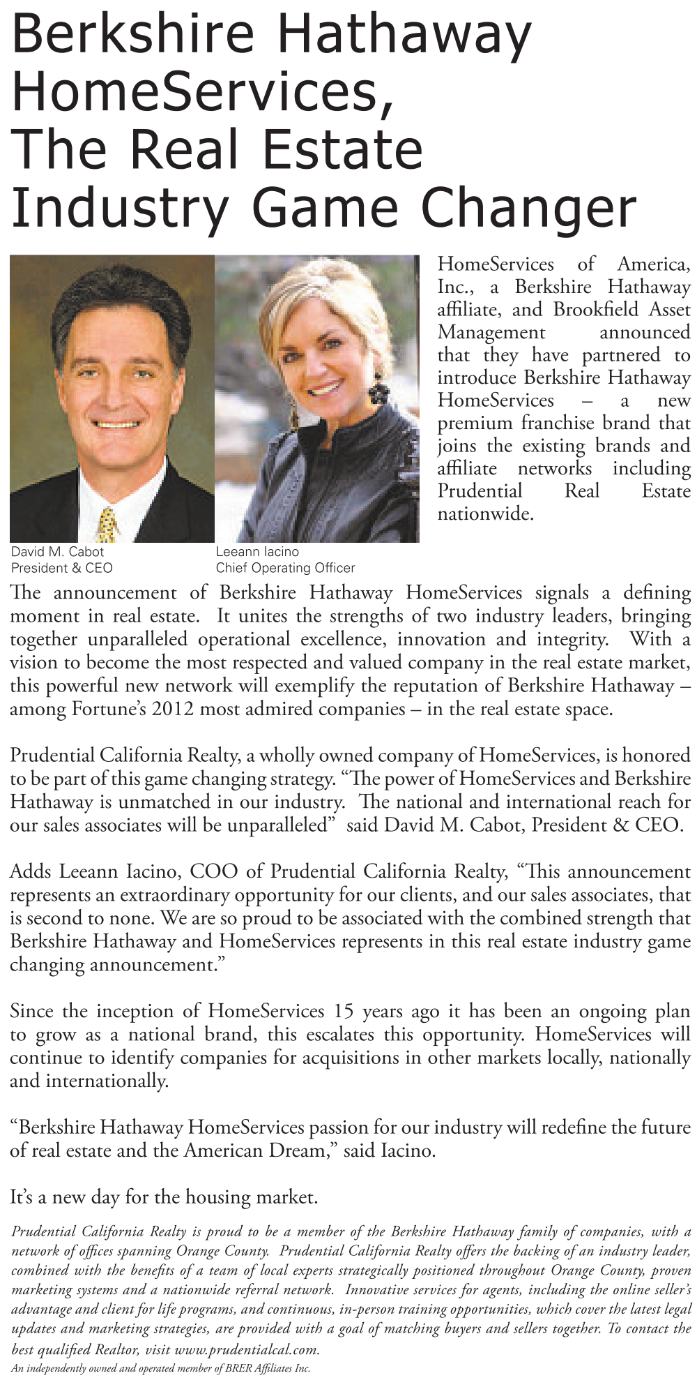 Adds Leeann Iacino, COO of Prudential California Realty, “This announcement represents an extraordinary opportunity for our clients, and our sales associates, that is second to none. We are so proud to be associated with the combined strength that Berkshire Hathaway and HomeServices represents in this real estate industry game changing announcement.”