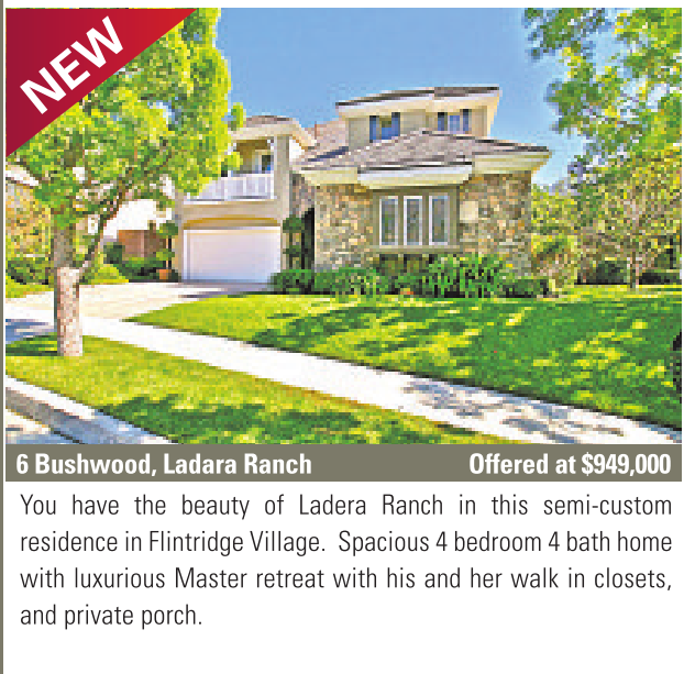 6 Bushwood, Ladara Ranch Offered at $949,000 You have the beauty of Ladera Ranch in this semi-custom residence in Flintridge Village. Spacious 4 bedroom 4 bath home with luxurious Master retreat with his and her walk in closets, and private porch.
