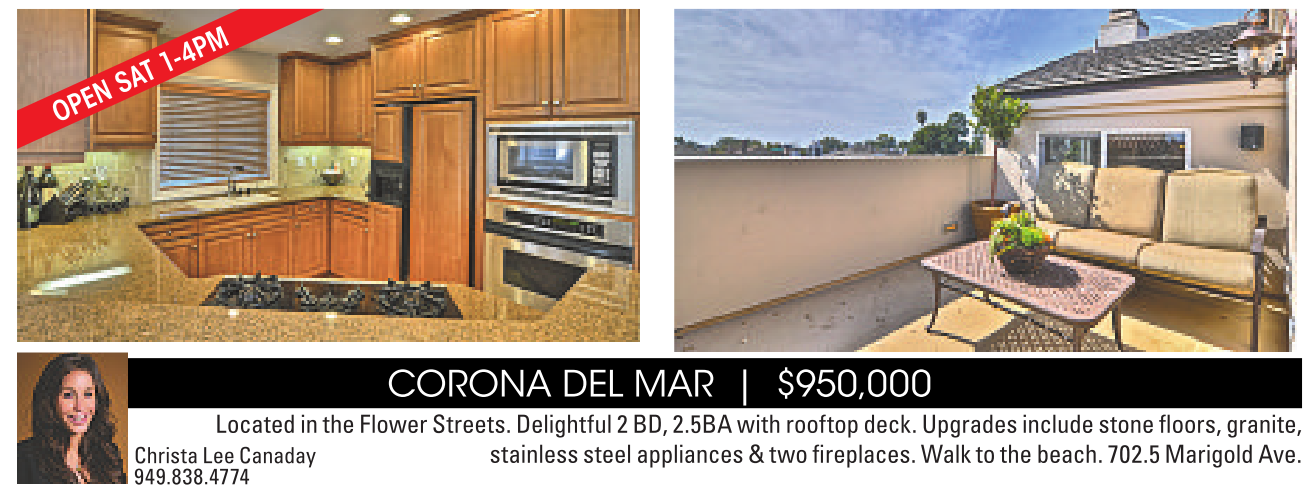 Locatedinthe Flower Streets. Delightful 2BD, 2.5BAwithrooftop deck.Upgradesincludestone floors, granite, stainlesssteel appliances &two fireplaces.Walktothe beach. 702.5Marigold Ave.