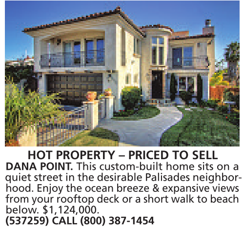 HOT PROPERTY – PRICED TO SELL DANA POINT. This custom-built home sits on a quietstreet in the desirable Palisades neighborhood. Enjoy the ocean breeze &expansive views from your rooftop deck or ashort walk to beach below. $1,124,000. (537259) CALL (800) 387-1454