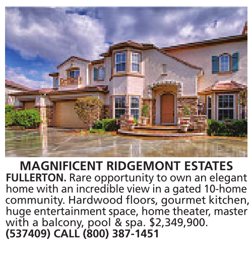 MAGNIFICENT RIDGEMONT ESTATES FULLERTON. Rare opportunity to own an elegant home with an incredible view in agated 10-home community.Hardwood floors, gourmet kitchen, huge entertainment space, home theater,master with a balcony, pool & spa. $2,349,900. (537409) CALL (800) 387-1451