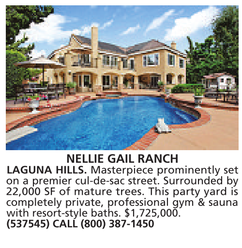 NELLIE GAIL RANCH LAGUNA HILLS. Masterpiece prominently set on a premier cul-de-sac street. Surrounded by 22,000 SF of mature trees. This party yard is completely private, professional gym & sauna with resort-style baths. $1,725,000. (537545) CALL (800) 387-1450